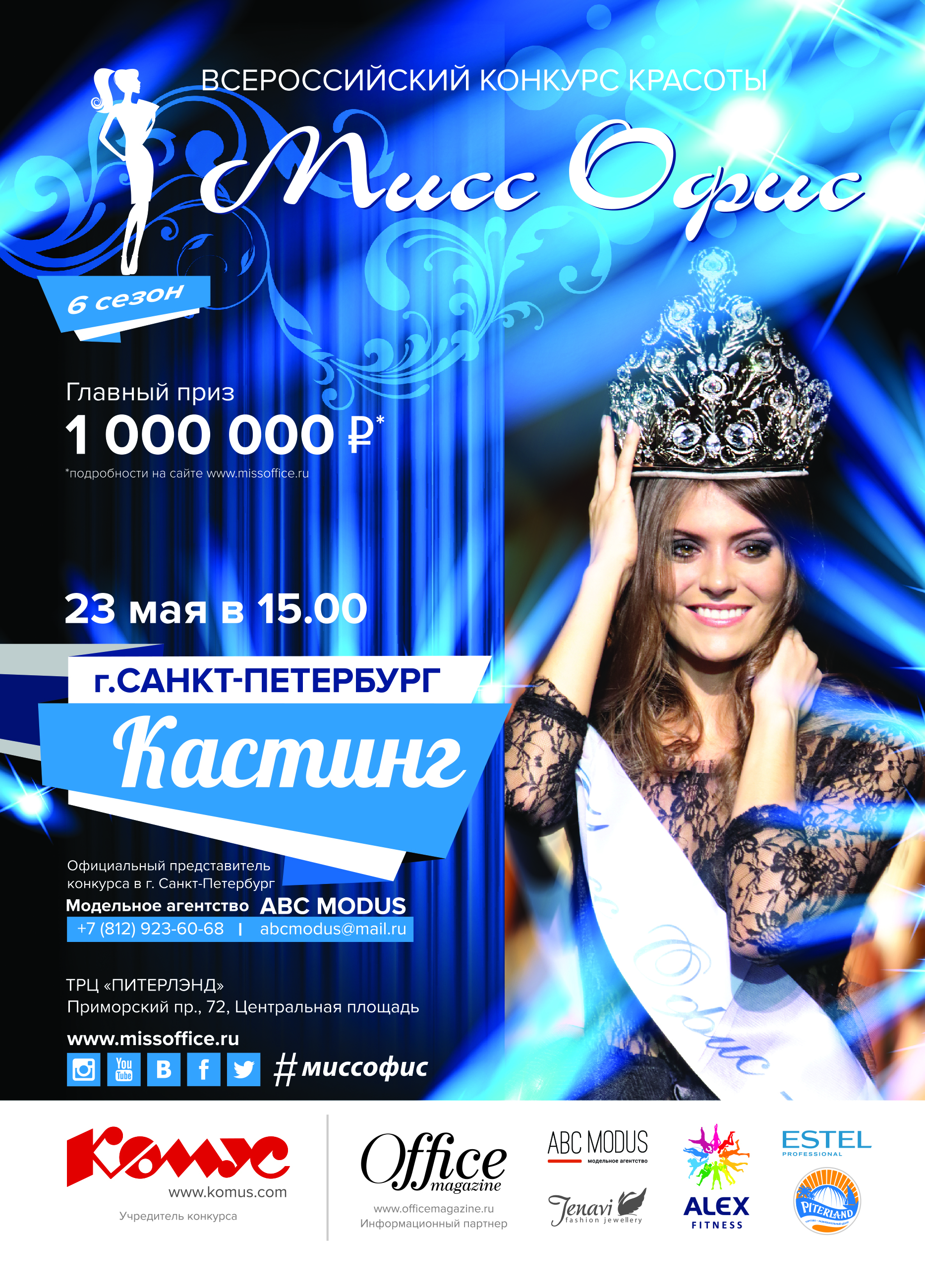23 мая – г.Санкт-Петербург. Кастинг Всероссийского Конкурса красоты «Мисс Офис» среди соискательниц из Северной столицы. Всех посетителей торгово-развлекательного центра "ПитерЛэнд" ждут мастер –классы, розыгрыши призов и всевозможные конкурсы. Мероприятие состоится в 15:00 по адресу: г. Санкт - Петербург, Приморский пр-т 72, Центральная площадь в ТЦ «ПитерЛэнд»